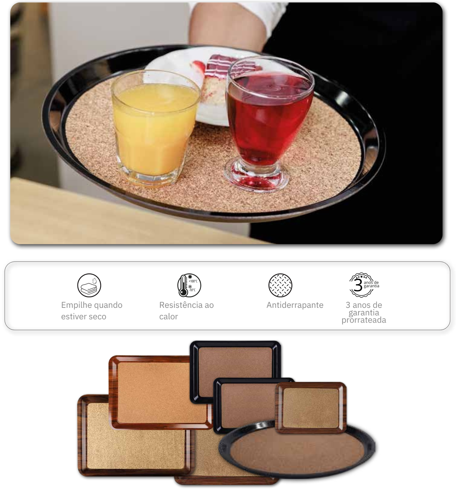 São bandejas laminadas revestidas de cortiça com superfície brilhante, feitas usando padrões decorativos. São fáceis de usar em áreas como cafés, restaurantes, hotéis, etc., graças ao caráter antiderrapante proporcionado pela superfície de cortiça. Não podem ser lavadas na máquina de lavar louça. São resistentes à quebra e impactos. É usada cortiça natural.