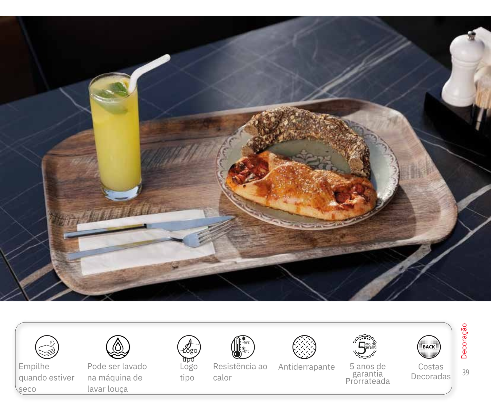 Com design moderno e ergonômico, as bandejas Deco são ideais para fast foods e cafés. Produzidas em resina de alto desempenho, oferecem resistência a produtos químicos e alta temperatura, além de diversas opções de personalização.