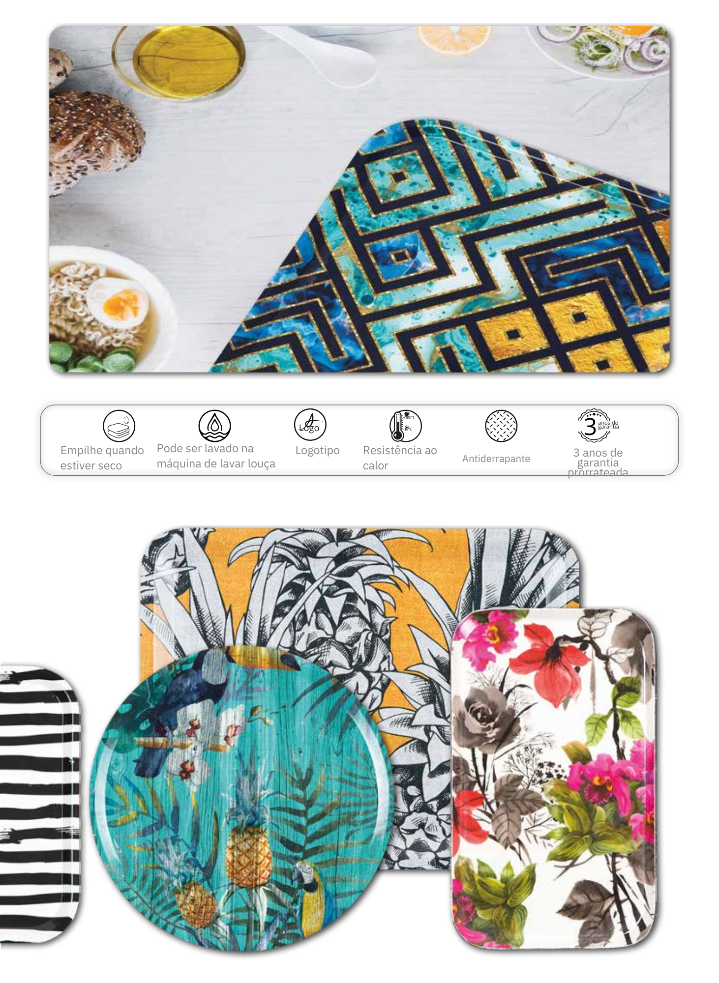 São bandejas laminadas produzidas em diferentes formas e tamanhos adequados para uso doméstico com logotipos e designs de clientes. Graças à superfície brilhante, a lavagem e a limpeza são muito mais fáceis. Elas são adequadas para contato com alimentos por meio da técnica de superfície com revestimento especial. Elas têm alta resistência a arranhões e abrasão, bem como resistência a agentes químicos e agentes es!ta ! nos. Podem ser lavadas na máquina de lavar louça.