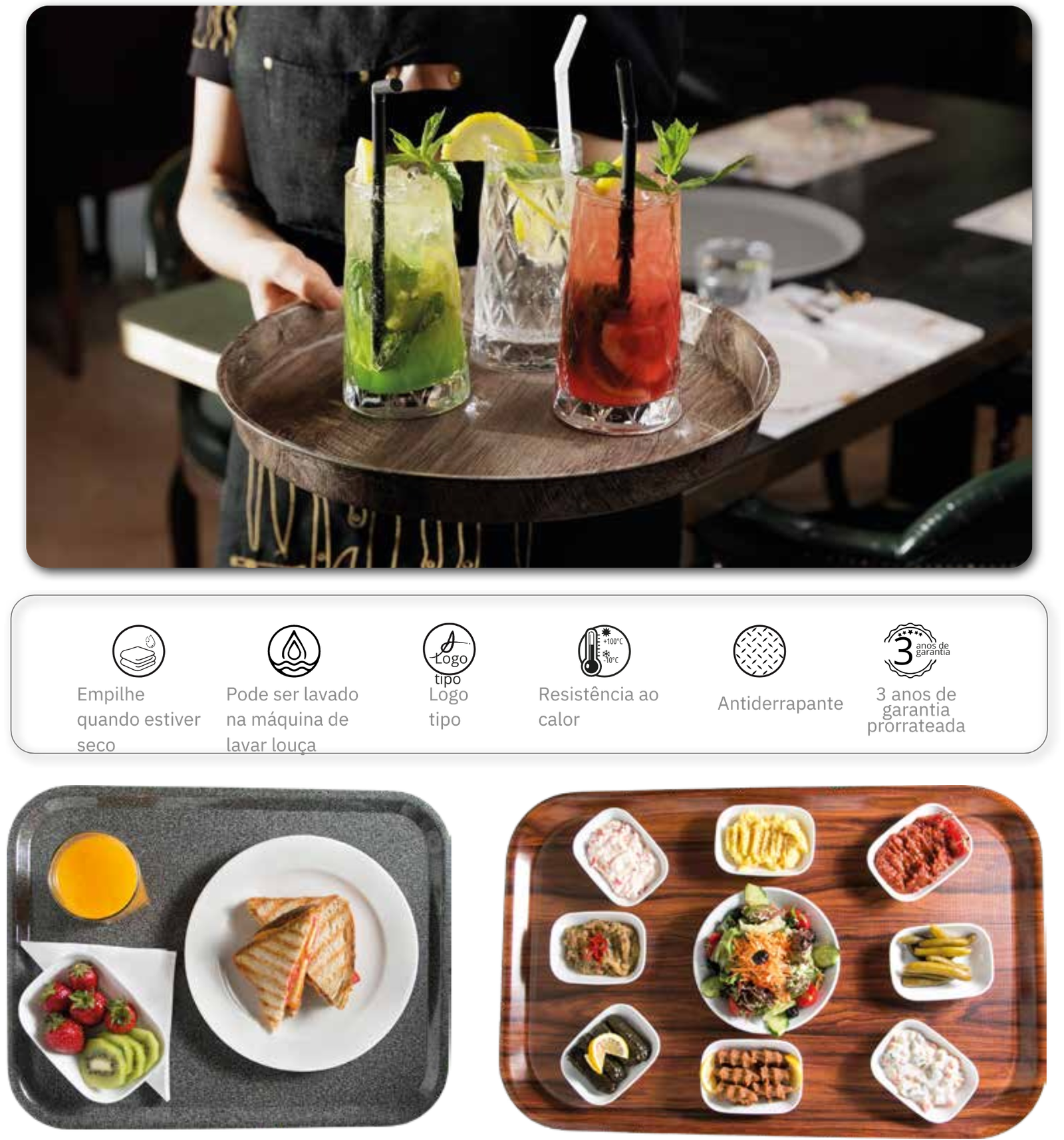 Estas são bandejas laminadas que dão um ambiente estético e decorativo às áreas de uso graças aos seus padrões naturais de madeira. Podem ser facilmente utilizadas para servir em áreas como cafés, restaurantes, hotéis e serviços de bufê, graças à aderência proporcionada pela superfície fosca. São adequadas para contato com alimentos, graças à técnica de superfície com revestimento especial. Possuem alta resistência a arranhões e abrasão, bem como resistência a agentes químicos e agentes químicos. Podem ser lavadas na máquina de lavar louça.