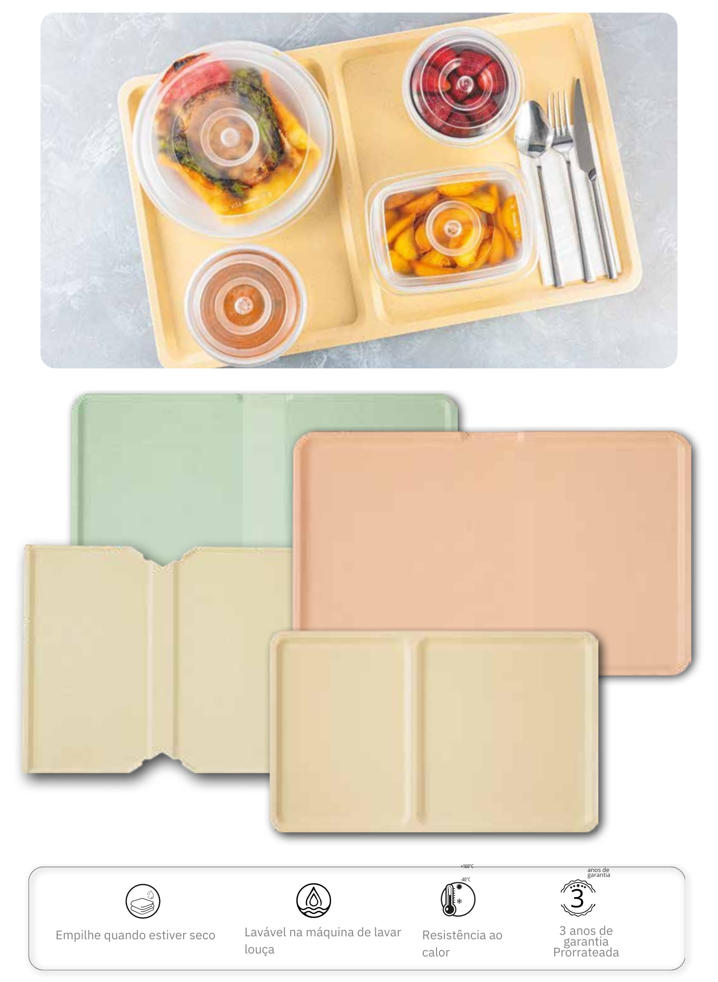 Foi projetado para áreas de uso direto com alimentos e está em conformidade com os requisitos dos regulamentos e padrões da UE 10/2011 e 2019/44. É feito de resina de poliéster de alto desempenho e é resistente a ácidos, produtos químicos e estatinas. Graças à sua alta resistência ao calor, é ideal para uso em carrinhos aquecidos e lava-louças industriais de alta temperatura. Você pode adicionar estética à sua empresa graças às suas vastas opções de cores. As abas empilháveis seguram as bandejas com segurança e facilitam a secagem através da passagem de ar entre elas. Projetado para uso intensivo de serviço de alimentos, o PREMIUM é uma escolha estética e com boa relação custo-beneficio. Bandejas Empilháveis quando estiverem secas, pode ser lavada na maquina de lavar louça, coloque sua logo, resistência ao calor antiderrapante , 5 anos de garantia, Backside logo.