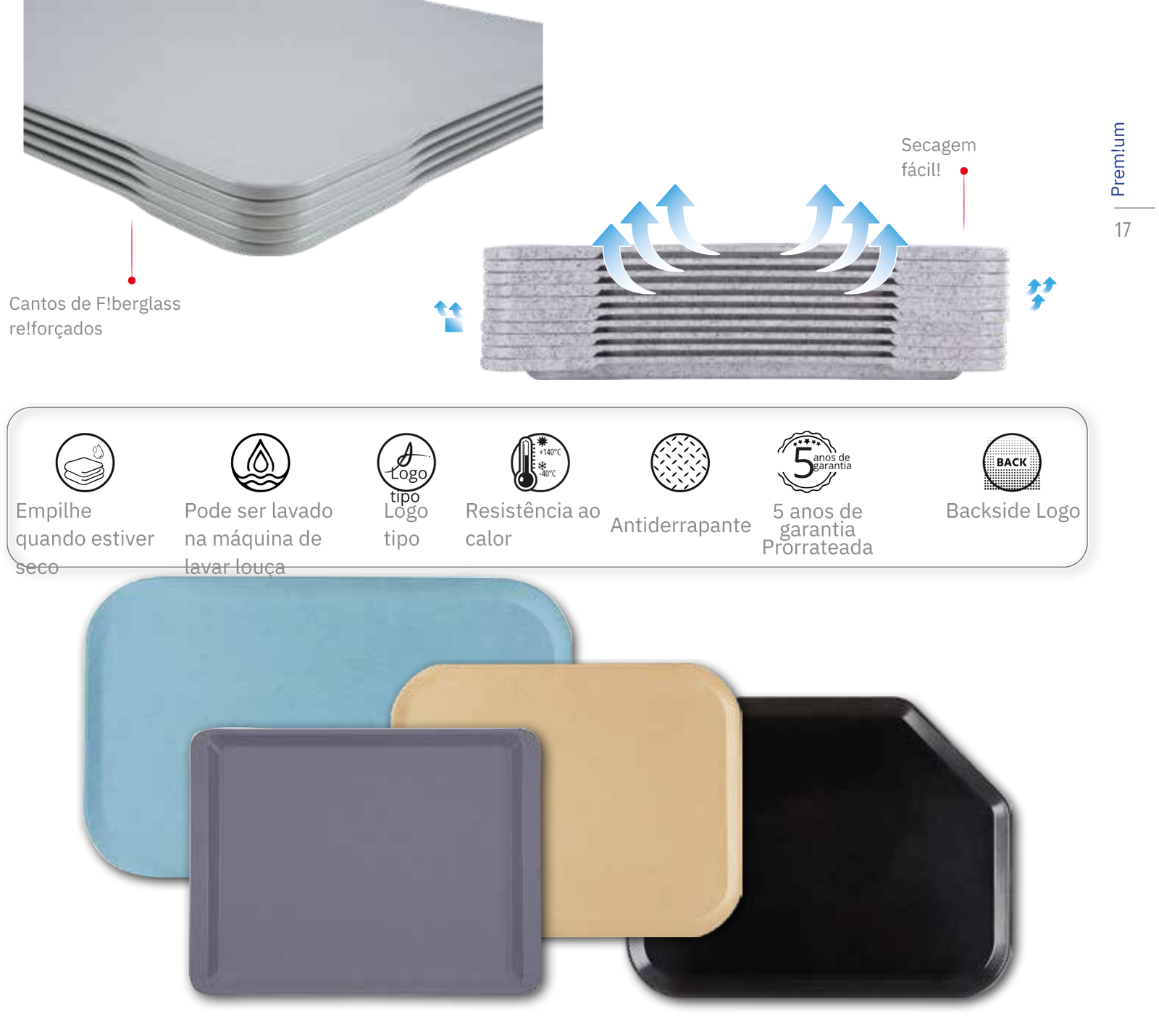 Projetadas para contato direto com alimentos, as bandejas Premium oferecem alta resistência química e térmica. Disponíveis em diversas cores e designs, essas bandejas são empilháveis e antiderrapantes, sendo perfeitas para serviços de alimentação de alta qualidade.