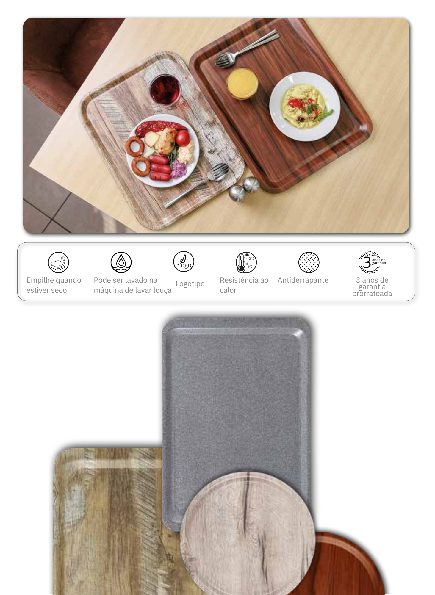 São bandejas laminadas produzidas em diferentes formas e tamanhos, para uso em serviços de limpeza, serviços de buffet, bares e cafés. Elas dão um ambiente estético e decorativo às áreas de uso graças aos padrões naturais de madeira. Graças à superfície brilhante, a lavagem e a limpeza são muito mais fáceis. Elas são adequadas para contato com alimentos por meio da técnica de superfície com revestimento especial. Elas têm alta resistência a arranhões e abrasão, bem como resistência a agentes químicos e agentes. Podem ser lavadas na máquina de lavar louça.