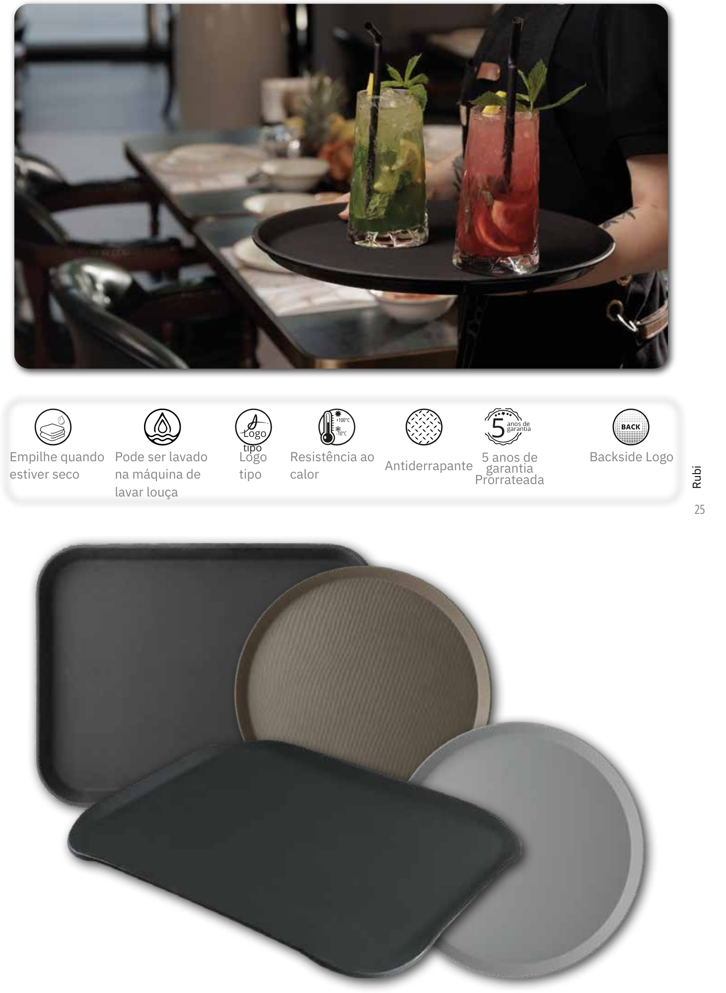 Com superfície de borracha antiderrapante, as bandejas Ruby são ideais para hotéis e restaurantes que lidam com grande fluxo de bebidas e alimentos. Elas garantem segurança e praticidade no transporte, além de serem altamente duráveis.