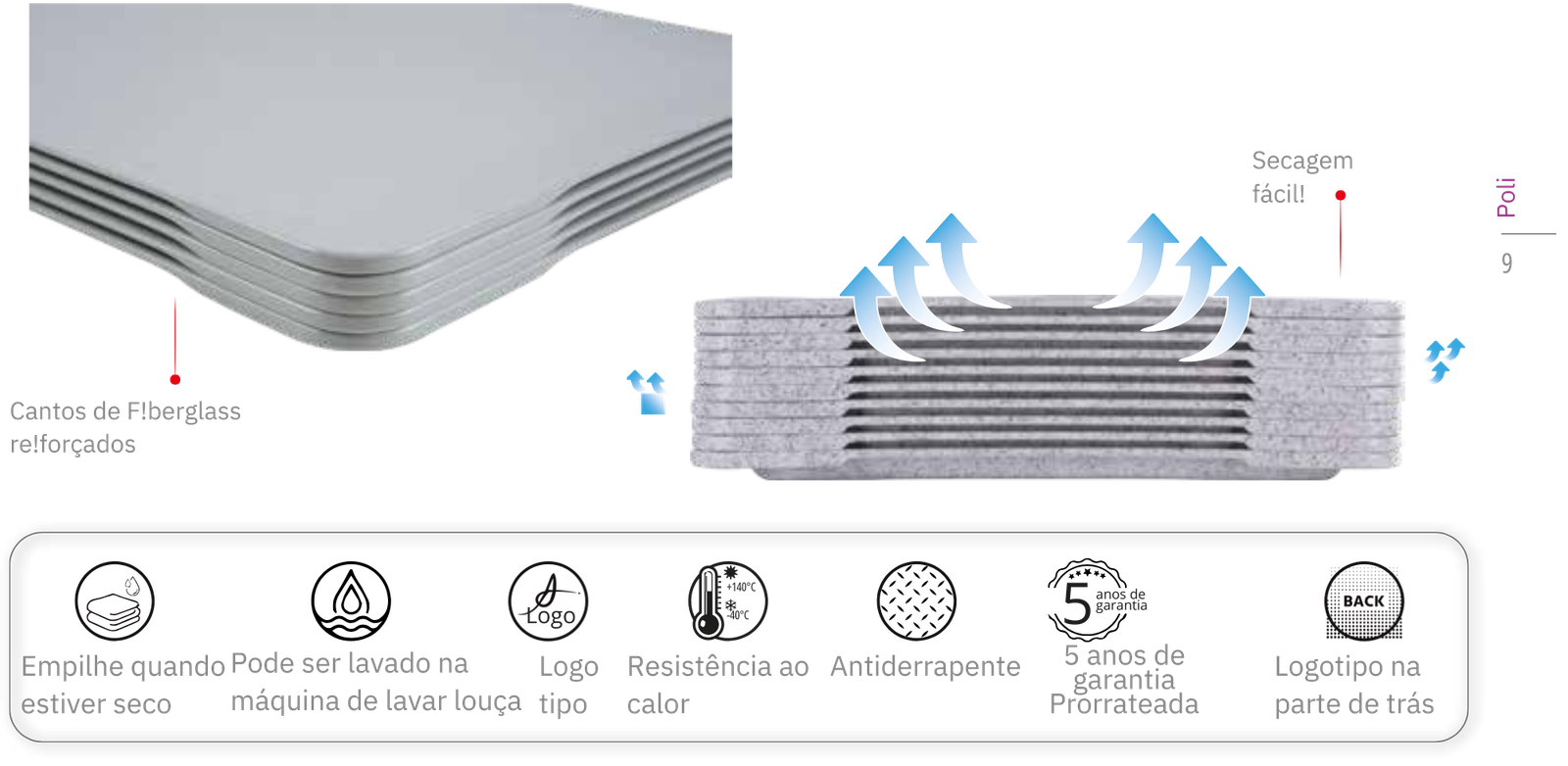 Feitas de poliéster reforado com fibra de vidro, as bandejas POLY são resistentes, duráveis e ideais para ambientes de uso intenso, como hospitais e cantinas. Com alta resistência ao calor e impactos, essas bandejas atendem aos padrões ISO e são laváveis em máquinas industriais.