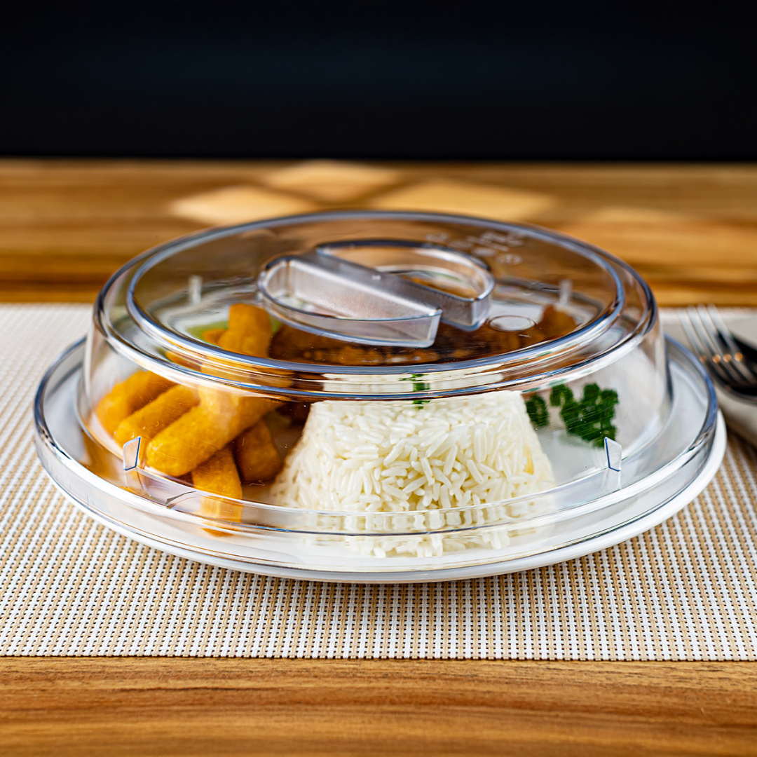 Seu design transparente permite visualizar completamente os alimentos, valorizando a apresentação sem comprometer a segurança. Além de proteger contra agentes externos, o cloche contribui para a conservação térmica das refeições, auxiliando no controle de temperatura durante o serviço ou transporte.