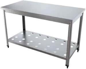Essa mesa é feita com aço inox escovado, o que significa que não enferruja, é super fácil de limpar e ainda tem aquela aparência profissional que passa confiança. O tampo é liso – ou seja, sem reentrâncias ou detalhes complicados. Isso faz com que a limpeza seja rápida e sem stress.